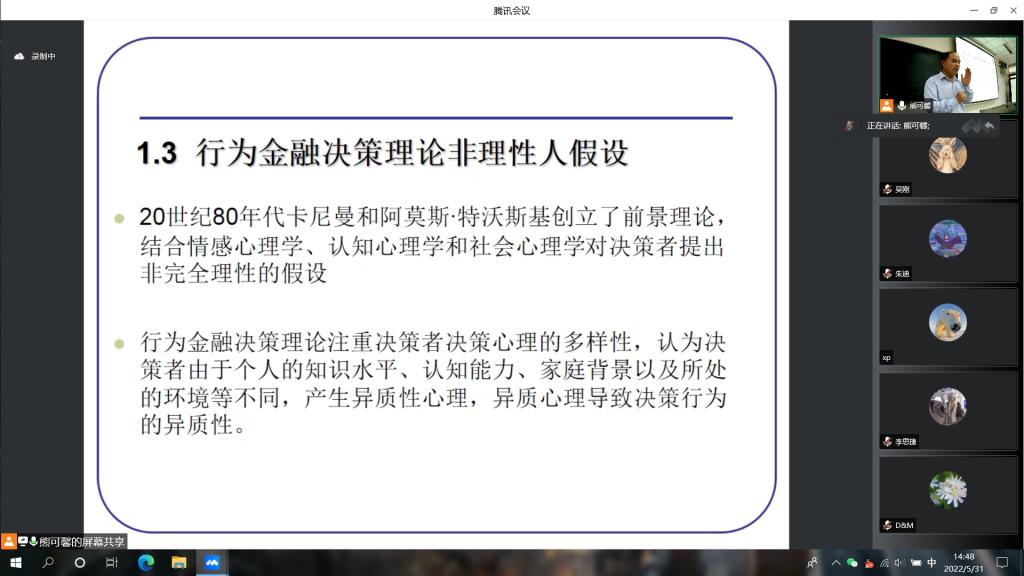 2022年5月31日下午,应太阳成集团122ccvip邀请,太阳成集团122ccvip金融公司副经理、博士生导师郭文旌教授进行了主题为“行为金融决策理论的产生及研究动态”的“博导有约”专题学术讲座。讲座采用线上、线下相结合的方式开展,公司硕博研究生积极参与。