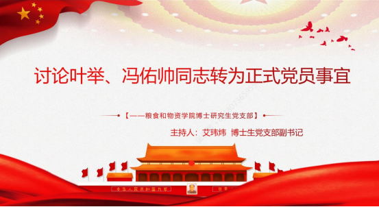 2022年10月25日,按照疫情防控相关要求,博士生党支部以线上形式召开支部大会,讨论叶举、冯佑帅两位同志转正事宜会议由支部副书记艾玮炜主持,全体党员参加会议。