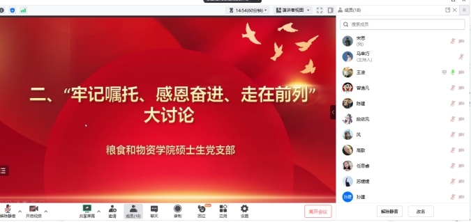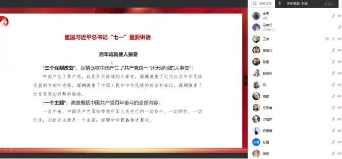 首先研究生党支部书记王凌带领大家从“全面建成小康社会”、“百年成就使人振奋”、“以史为鉴、开创未来”三部分重温了习近平总书记“七一”重要讲话。