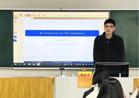 潘俊宇同志分别从期刊分类、期刊选择、中英文写作区别进行经验分享。首先,他介绍了一般的期刊分类和CAS、JCR及中科院的分区标准和区别。其次,他从自身研究经历出发讲述了中文与英文论文在写作中的差异。他认为中文和英文论文最大的区别在于论文首尾部分的内容。最后,他还强调在写作过程中要先打好理论基础再进行实证分析,切勿本末倒置。