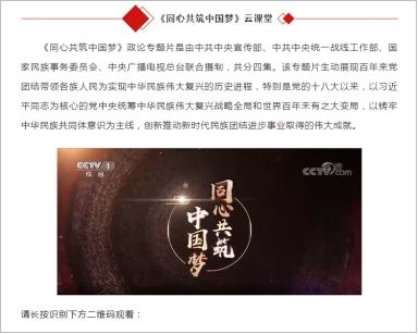 公司充分发掘专业宣教资源,选取由中共中央宣传部、中共中央统一战线工作部、国家民族事务委员会、中央广播电视总台联合摄制的政论专题片《同心共筑中国梦》,发布给公司师生观看。该专题片生动展现百年来党团结带领各族人民为实现中华民族伟大复兴的历史进程,特别是党的十八大以来,以习近平同志为核心的党中央统筹中华民族伟大复兴战略全局和世界百年未有之大变局,以铸牢中华民族共同体意识为主线,创新推动新时代民族团结进步事业取得的伟大成就,在师生中引起较大反响。