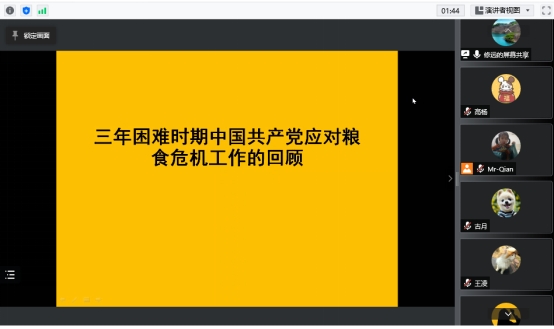 郭老师首先简要介绍了三年困难时期的粮食形势,并总结了粮食危机产生的主要原因。危难之际,中国共产党深入调研粮食危机,召开一系列会议研究解决粮食问题。此后,党针对粮食危机展开了全面应对行动,增加农业投入比重,精简城镇人口,提高农业人力投入,以尽快恢复农业产能,调整农村发展政策,提高农村发展综合水平,最终粮食危机基本得到解决。分享的最后,郭晓东老师总结了应对粮食危机的教训,主要表现在信息沟通机制不畅以及民主决策机制的不健全,并进一步总结了应对粮食危机的经验。