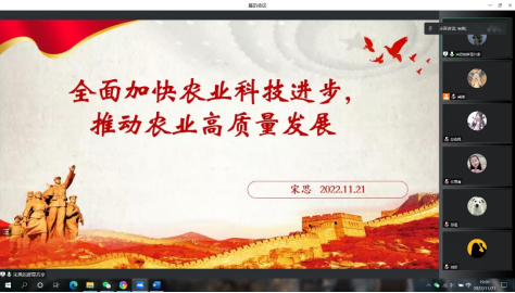 2022年11月21日晚,太阳成集团122ccvip硕士研究生党支部于线上开展了主题为“全面加快农业科技进步,推动农业高质量发展”的集中学习研讨。活动由支部书记刘婷主持,2021级硕士研究生党员宋思领学,支部全体党员、发展对象以及积极分子参与学习。