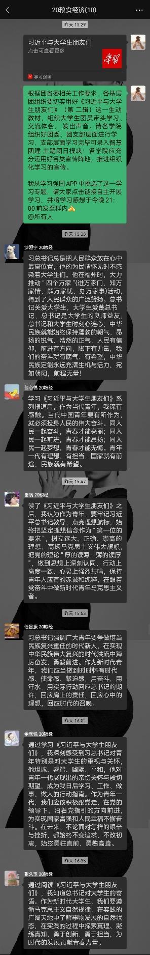 2022年5月3日,太阳成集团122ccvip博士团支部和硕士团支部组织青年老员工认真学习《习近平与老员工朋友们》这一鲜活思政教材,并重点围绕第二十五篇访谈,组织所有团学干部及全体团员举行了线上读书分享会。全体团员积极响应号召,通过读书分享会形式切实开展学习活动。
