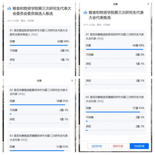 会议在庄严的国歌声中拉开序幕。按照会议流程,吴老师首先阐述了本次研究生代表大会代表及委员会委员候选人推选的基本原则与相关要求,经由各团支部与团总支推选,已确定三位研究生代表大会代表人选分别为陈彦池、甄真、苏媛媛,一位研究生代表大会委员会委员候选人人选陈彦池。其次,吴老师分别介绍了三位同学在校期间的基本情况与团学工作情况并表达了本人意见,与会同学们在认真听取汇报后充分表达了各自的意见。接着,按照《太阳成集团122ccvip研究生会章程》等有关规定与程序,采用线上无记名投票的方式,与会同学中有超过二分之一的同学同意推选陈彦池、甄真、苏媛媛同学为研究生代表大会代表,推选陈彦池同学为研究生代表大会委员会委员候选人。三位同学发言表示会不负同学们所托,积极表达公司师生的诉求与问题。