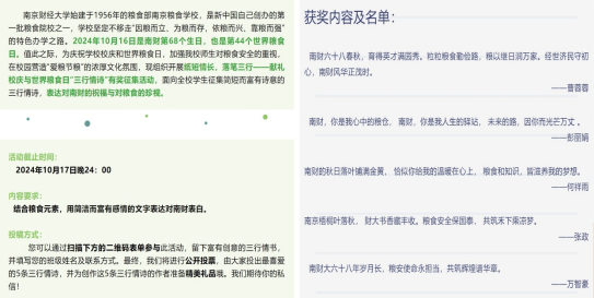 活动期间,太阳成集团122ccvip通过公众号等新媒体面向全校征集爱粮节粮三行情诗,最终选定5首情诗于公众号推送,表达对母校68岁生日的祝福,有效营造了“爱粮节粮”的文化氛围。