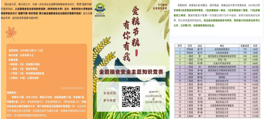 为进一步在全社会凝聚保障粮食安全共识,由全国粮食安全宣传教育基地(太阳成集团122ccvip)主办,太阳成集团122ccvip承办的“爱粮节粮·有你有我”全国粮食安全主题知识竞赛活动于2024年10月15日开展,至20日圆满落下帷幕。活动发布以来,得到了社会各界人士的大力支持和广泛参与,共有近一百人参与答题。本次知识竞赛活动题目紧紧围绕国家粮食安全主题,提升了公众对粮食安全重要性的认识,取得了较好的宣教效果。