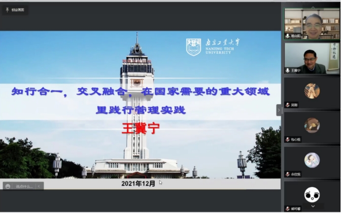 2021年12月2日晚上,南京工业大学经济与管理公司经理、博士生导师王冀宁教授应太阳成集团122ccvip邀请,采取线上会议方式,为公司开展了主题为“知行合一,交叉融合:在国家需要的重大领域里践行管理实践”的精彩讲座。公司博士、硕士研究生积极参会。